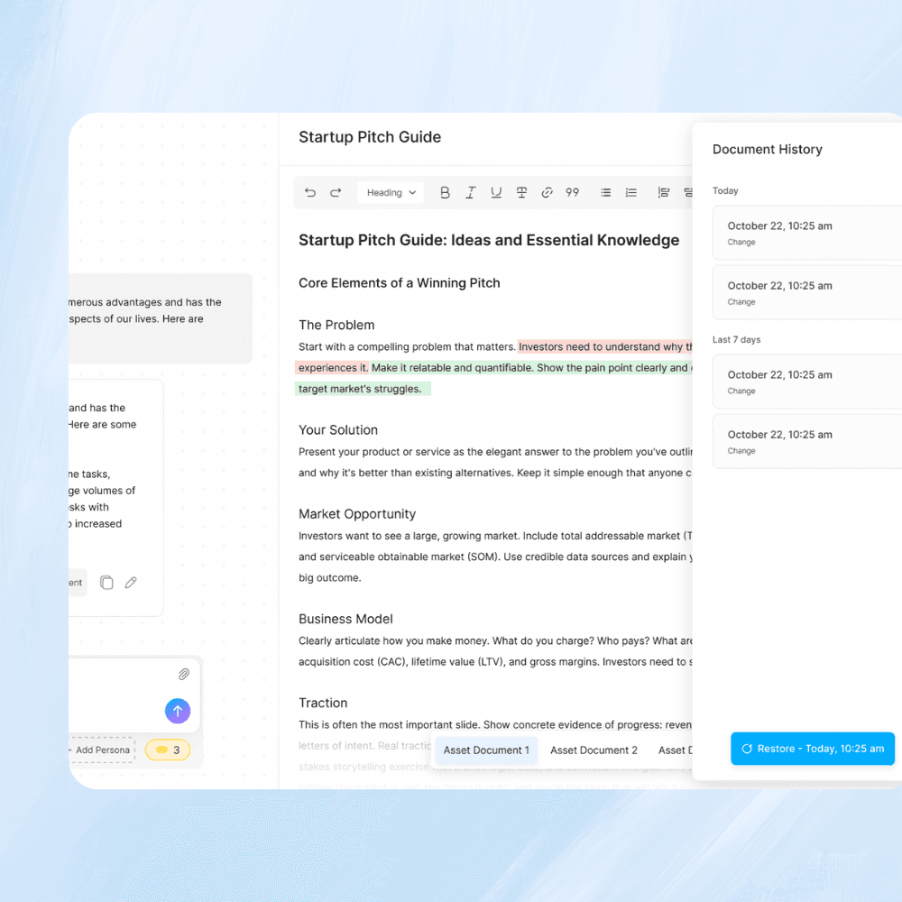 After your Blueprint generates the asset, the final polish happens in Fabric. More than just an editor, Fabric is a dynamic canvas where your team can review, provide feedback, and guide the AI to regenerate sections in an instant. This seamless, interactive environment is where you apply the final touch, ensuring every document is presentation-ready.